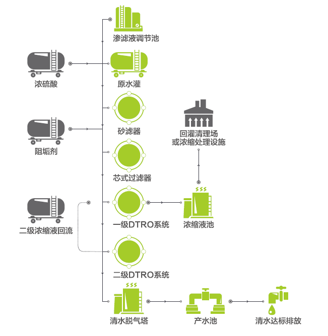 通过提升泵将渗滤液输送至两级DTRO渗滤液处理设备处理,产水达到排放标准直接外排,浓缩液回灌至填埋场。