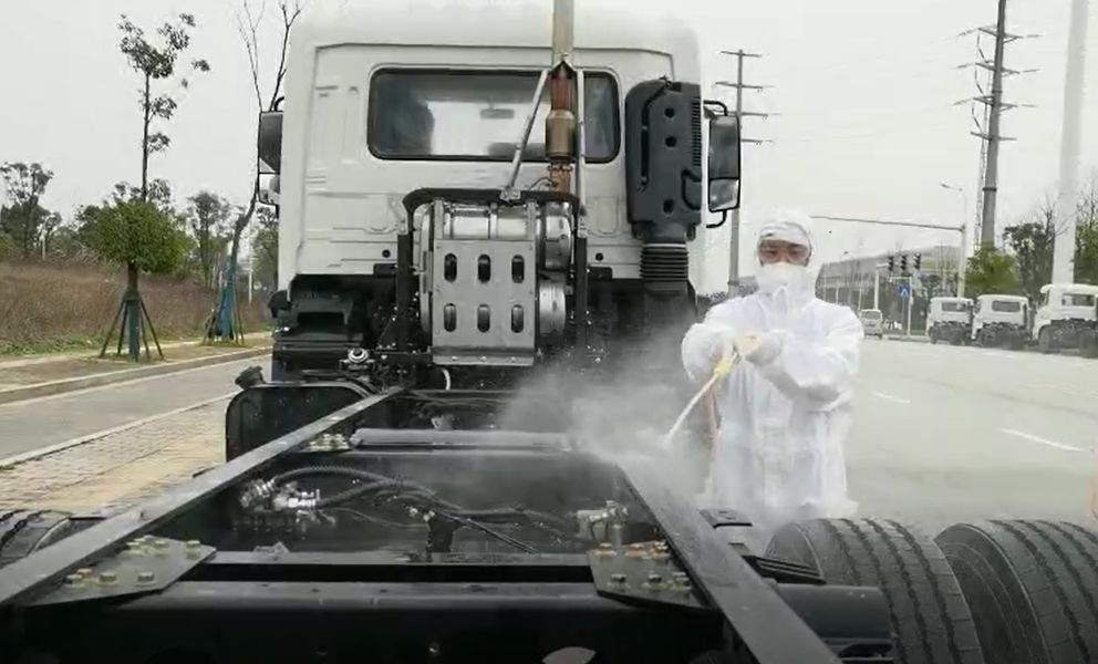 东风商用车生产基地在湖北十堰疫情重灾区,东风商用车的物流司机将底盘车送至湖南境内的高速路口岳阳北收费站后返回湖北集中隔离,再由jiuyou.com九游环境的物流司机接回厂区。整个交接运输过程中,每一辆底盘车在出厂、高速路口、jiuyou.com九游环境长沙园区必须经历三次的专业消毒,确保安全,万无一失。